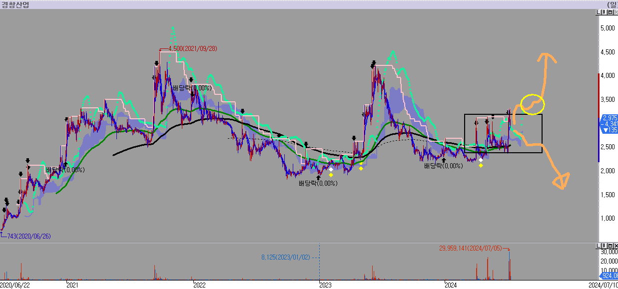 경창산업 주가는 최근 파동이 커지면서 위아래로 움직이고 있는 모습입니다. 만약 현재 박스권 상단을 재돌파하고 안착한다면, 정말 강하게 상승이 나올 수 있어 관심이 필요합니다.그러나 주가가 돌파가 나오지 않고 하락이 나온다면, 박스권을 깰 확률이 높아보이는 자리라 조심할 필요가 있습니다.